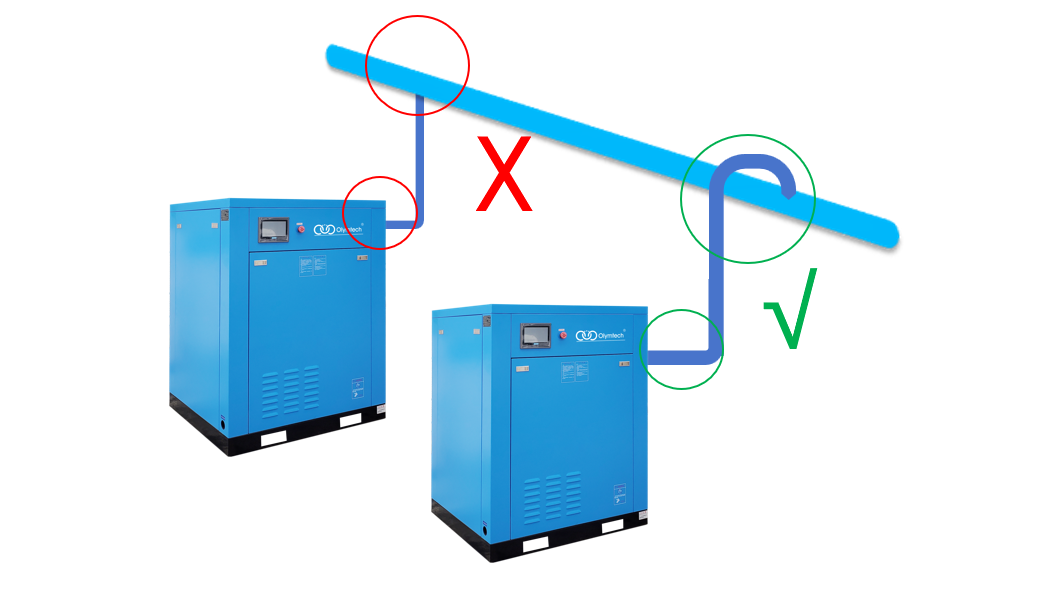 condensate buildup. To improve performance, minimize unnecessary bends, use properly sized pipes, and ensure proper drainage. The main pipeline should be larger than the compressor outlet , and branch connections should avoid direct T-joints to maintain smooth airflow.